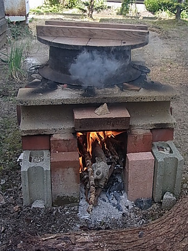 うちでは5升の窯に筍とあく抜きのためのお米をいれて湯を沸かします。
