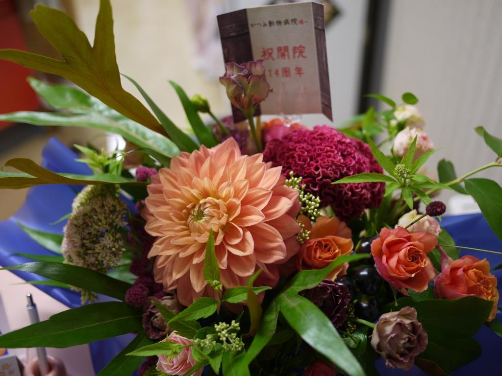 当院はおかげさまで14周年を迎えることができました。 小規模の病院ですが、信頼できるスタッフに恵まれ、私たちを信頼して下さる飼主の皆様に支えられてここまでやってこれました。 これからも、話をよく聞き、丁寧かつ正直に診察していくことを心がけていきます。 15年目も皆様に寄り添える病院でありたいと思います。 宜しくお願いいたします。 14周年のお祝いに頂きました! 待合室に飾ってます。